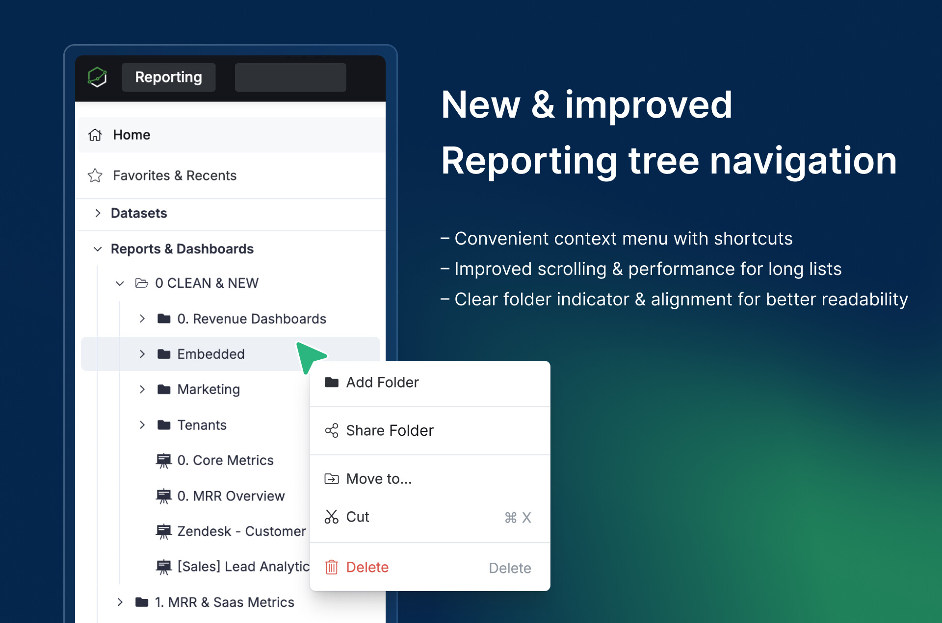 Reporting tree navigation - Refined the navigation tree to support faster file management via context menu and shortcuts, plus easier navigation with a new folder indicator