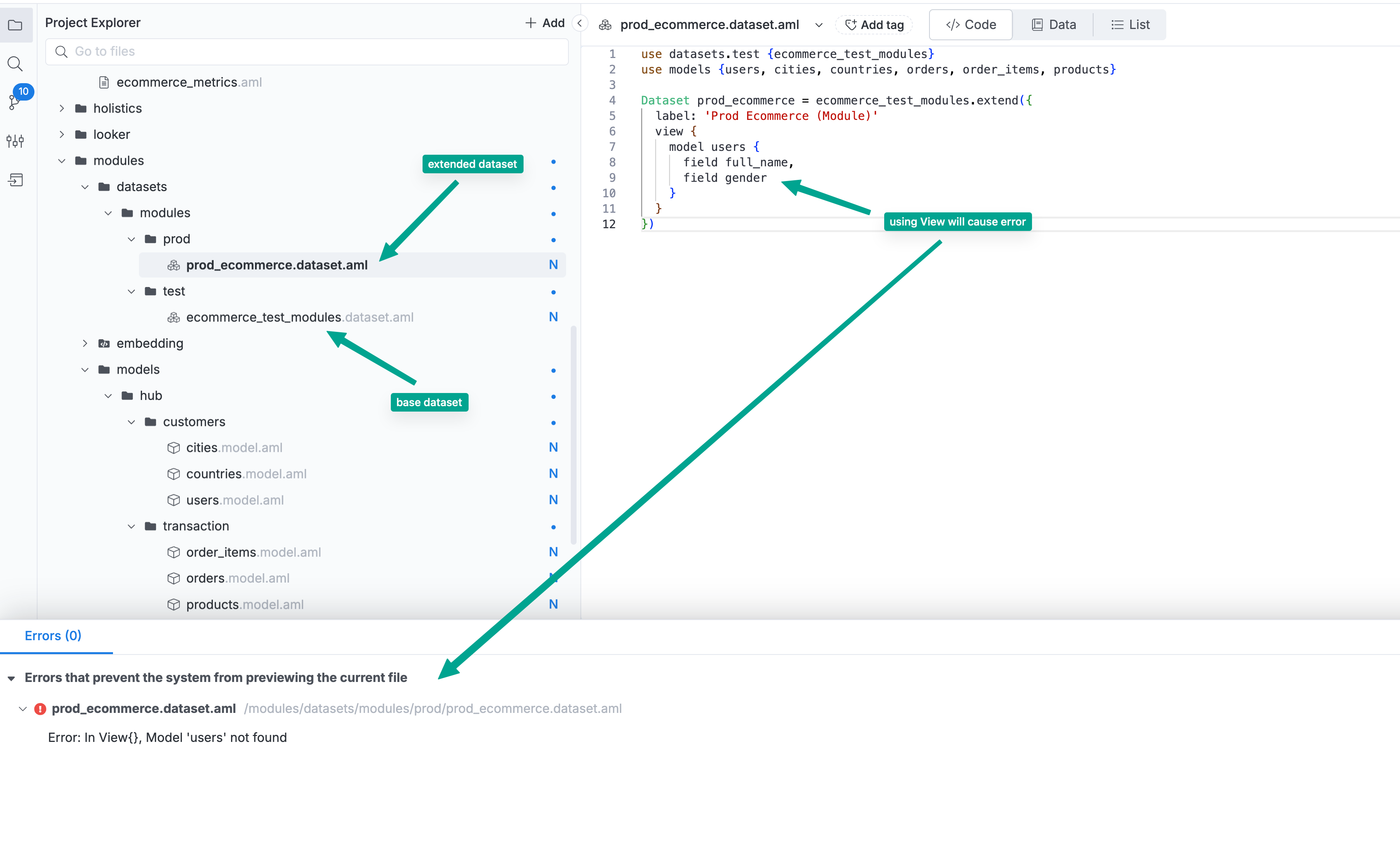 Right now, defining a Dataset View in an Extended Dataset when using modules isn’t supported. That’s why you’re seeing the error.