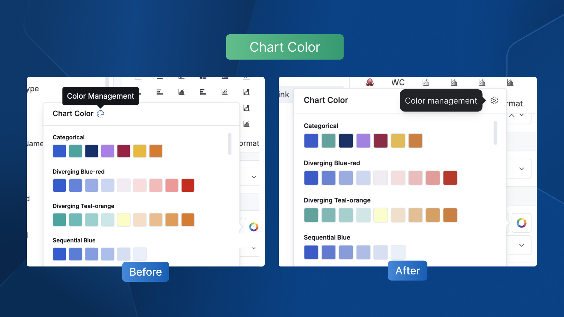 We believe that even small changes can enhance your experience. That’s why we’ve replaced the ambiguous color palette icon with a more intuitive settings icon. It’s now easier for you to recognize where you can manage chart colors.