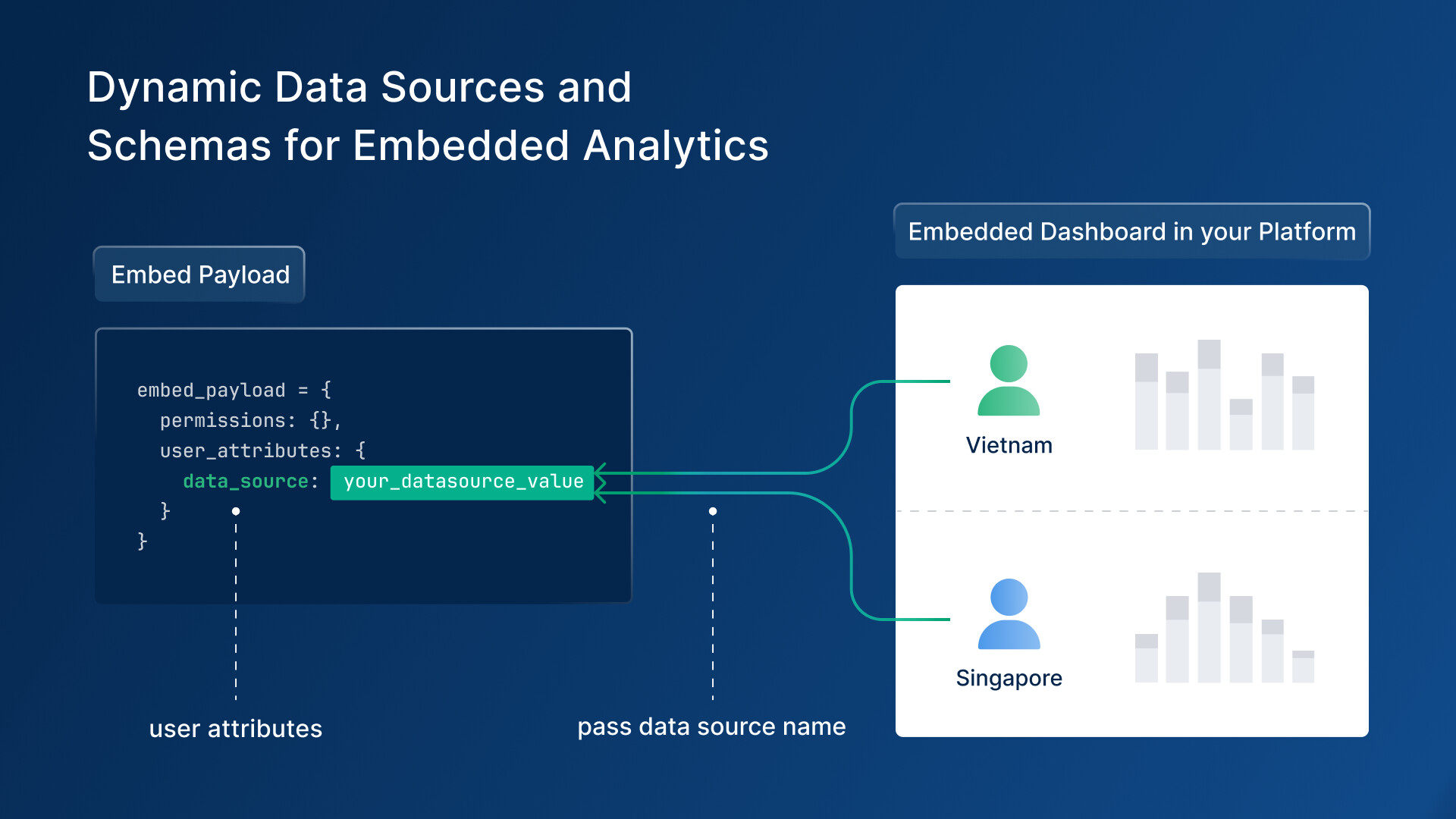 How it works: Define variables like H.current_user.data_source and H.current_user.schema in your AML code, then pass the appropriate values through your embedded payload—the system automatically routes each user to their designated data source.