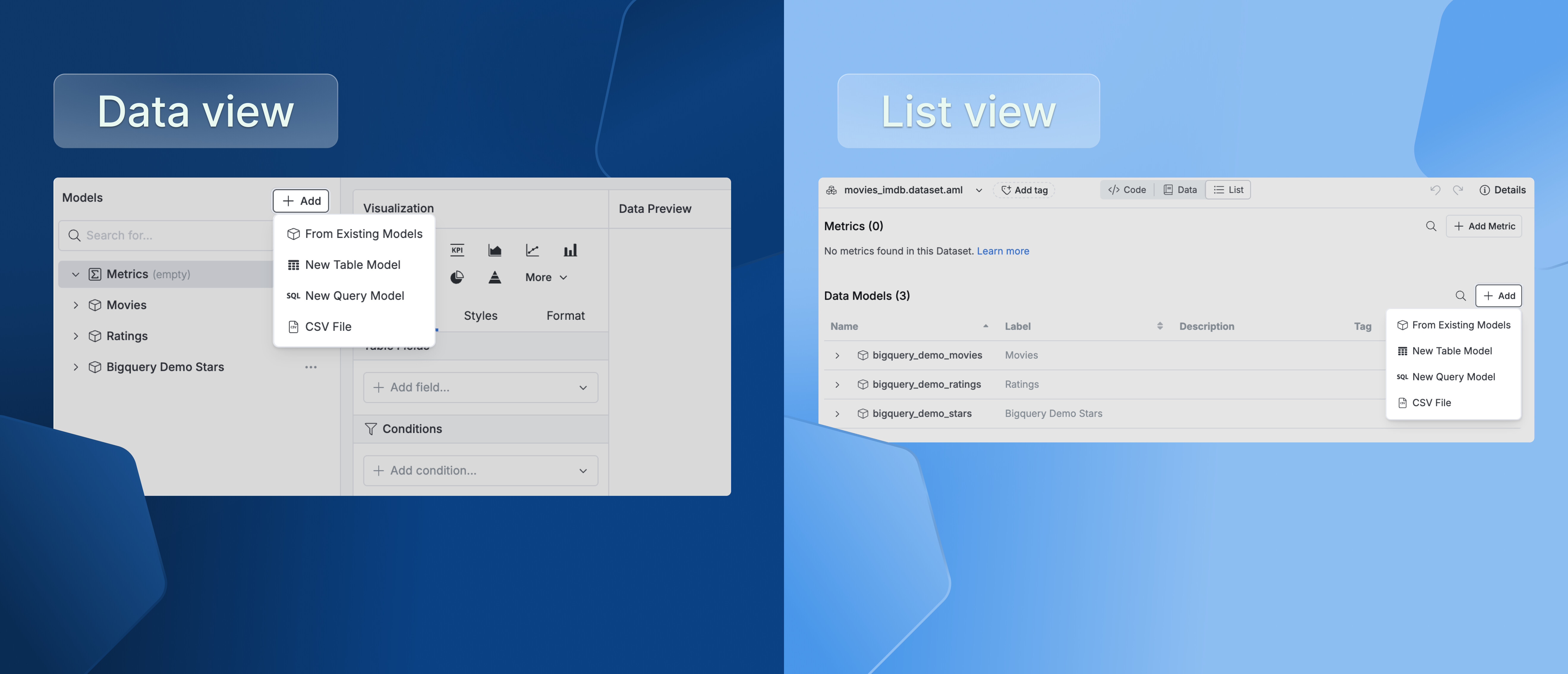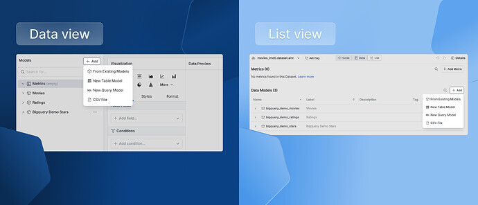 Enabled creating table and query models directly within an existing dataset, so they’re instantly included with no extra steps needed.