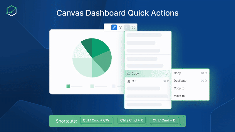 - A complete set of copy actions: Copy/Paste (within a tab, across tabs, and across dashboards), Duplicate, Copy To / Move To any tab, dashboard, or folder, plus Cut.