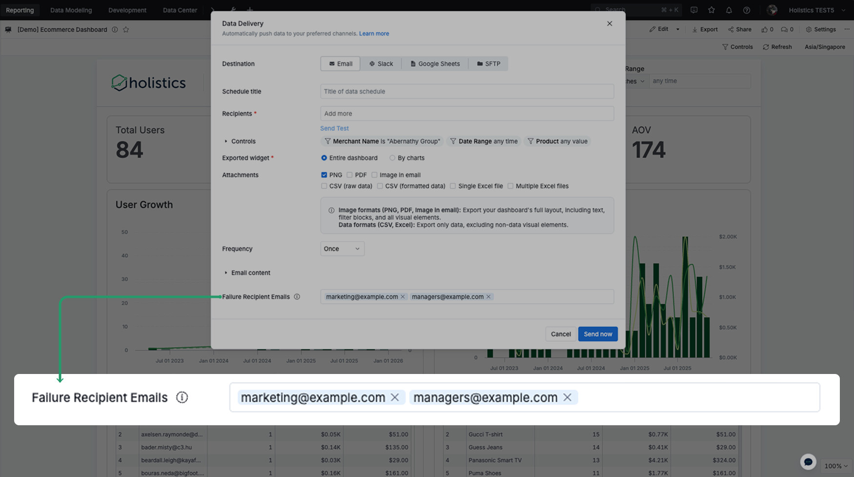 This feature lets you add custom recipients to receive failure notifications for each individual schedule or alert, on top of the default recipients.