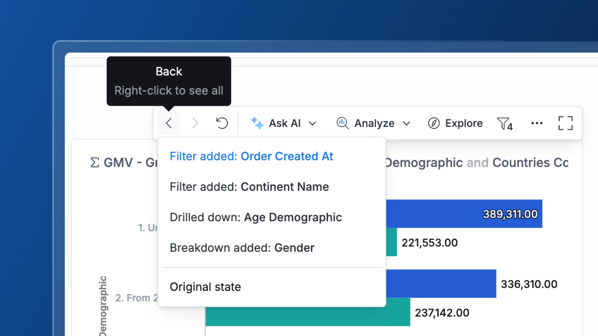 - Undo/Redo for filters: Previously, only drill-downs and break-downs were reversible. Now, every step of your analysis β from filtering to drilling down β can be undone or redone, giving you more freedom to explore without worry.